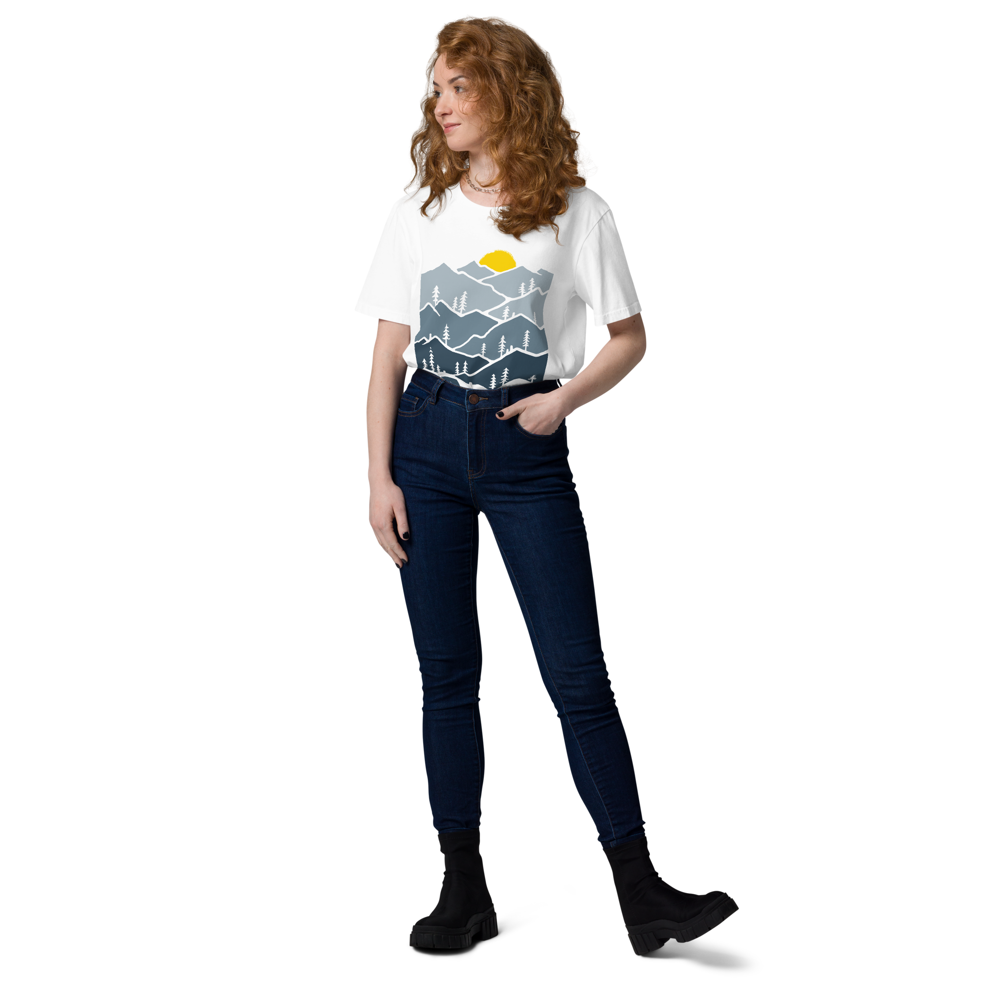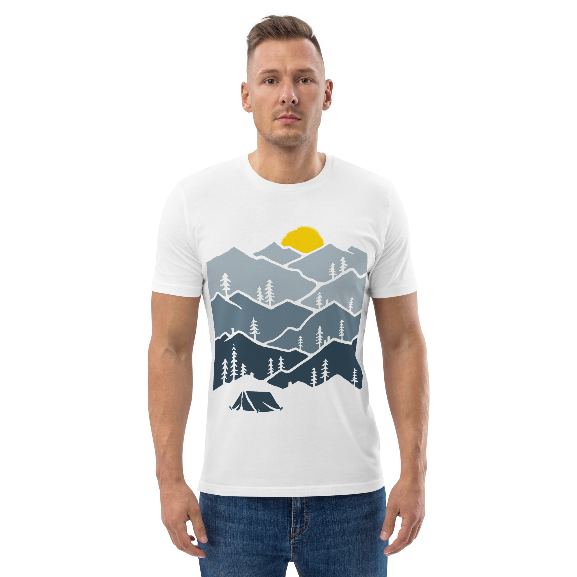 A clean, minimalist tee featuring layered mountains, pine trees, and a bold sunset. Perfect for everyday wear with a nature-inspired edge.