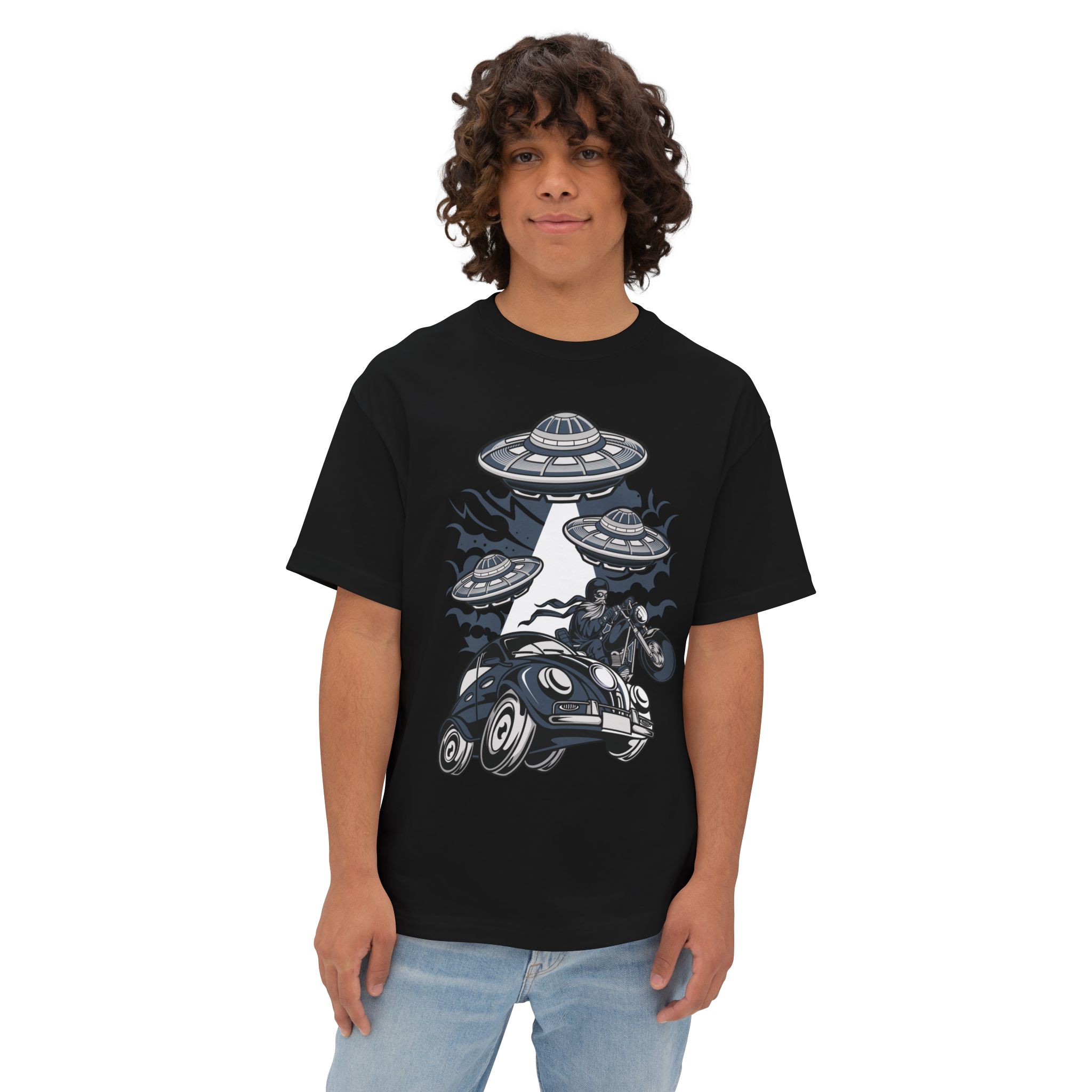 Make a statement with this bold sci-fi graphic tee featuring UFOs, a classic car, and an alien abduction scene. Designed for a standout streetwear look, this black tee blends retro vibes with futuristic edge—perfect for everyday wear with personality.