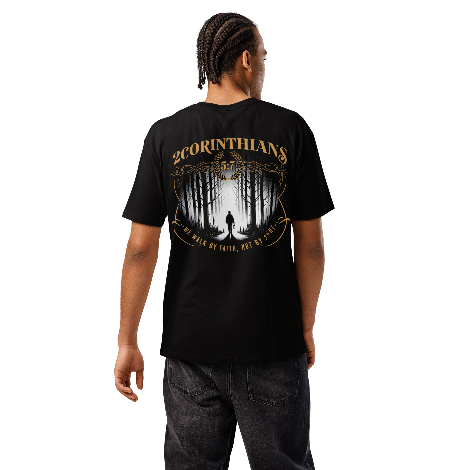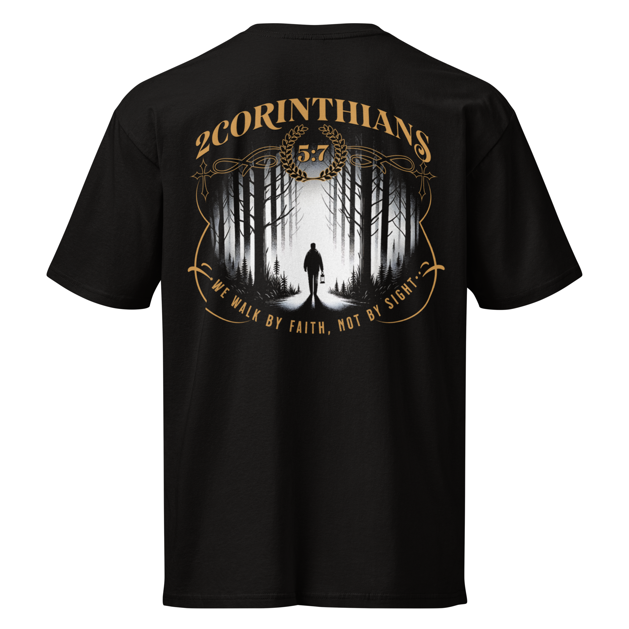 Walk boldly in faith with this striking statement piece. Featuring a powerful 2 Corinthians 5:7 design, the back artwork captures a lone figure journeying through a forest—symbolizing trust in God beyond what we see. Finished with elegant gold typography and detailing, this tee blends spiritual depth with modern streetwear style.